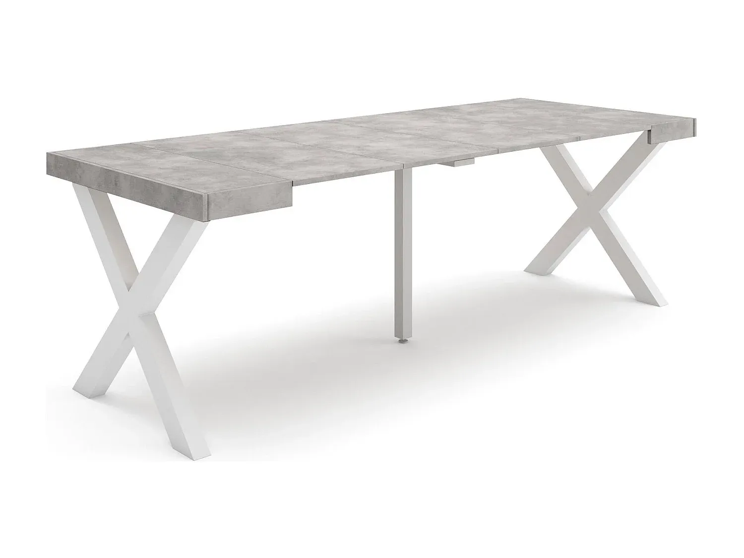Der ausziehbare Tisch ist vielseitig und kann je nach Bedarf erweitert werden. Mit einem Teleskopmechanismus aus Aluminium und einem zentralen Bein sorgt er für Stabilität. Verankerungsmechanismen fixieren die Tischposition und verhindern ein ungewolltes Öffnen. Der Tisch präsentiert sich in Zementoptik. Maße im geschlossenen Zustand: 90 cm Breite x 58 cm Tiefe. Die Länge kann zwischen 99 cm und 222 cm variiert werden, wodurch Platz für bis zu 10 Personen entsteht. Die Verlängerungen bestehen aus Holz und sind ebenfalls in Zementoptik.