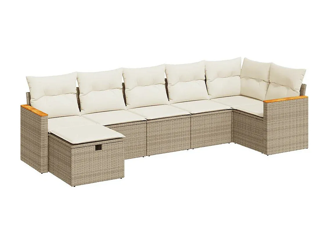 Erlebe eine funktionale Garten-Sofagarnitur, ideal für Terrasse oder Innenhof. Das Set ermöglicht entspanntes Beisammensein im Freien. Hergestellt aus PE-Rattan, bekannt für seine Langlebigkeit und einfache Pflege, das Material bietet eine naturnahe Optik. Es ist wetterbeständig und wird oft in Gartenmöbeln verwendet. Unter der Sitzfläche befindet sich ein Staufach mit wasserabweisendem Beutel zur Aufbewahrung. Der Hocker bietet zusätzliche Flexibilität und kann als Sitz oder Ablage genutzt werden. Die abnehmbaren Kissenbezüge sind waschbar und erleichtern die Pflege. Das modulare Design erlaubt eine individuelle Anpassung an den Außenbereich. Wir empfehlen, die Möbel mit einer Schutzhülle zu versehen. Die Abmessungen des Sets sind genau aufeinander abgestimmt.