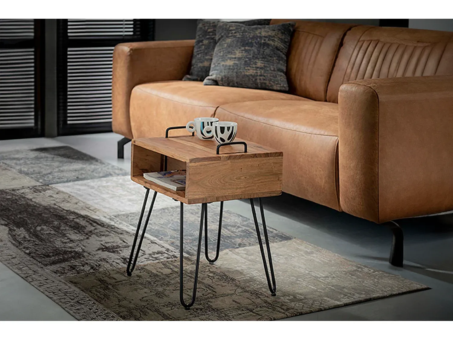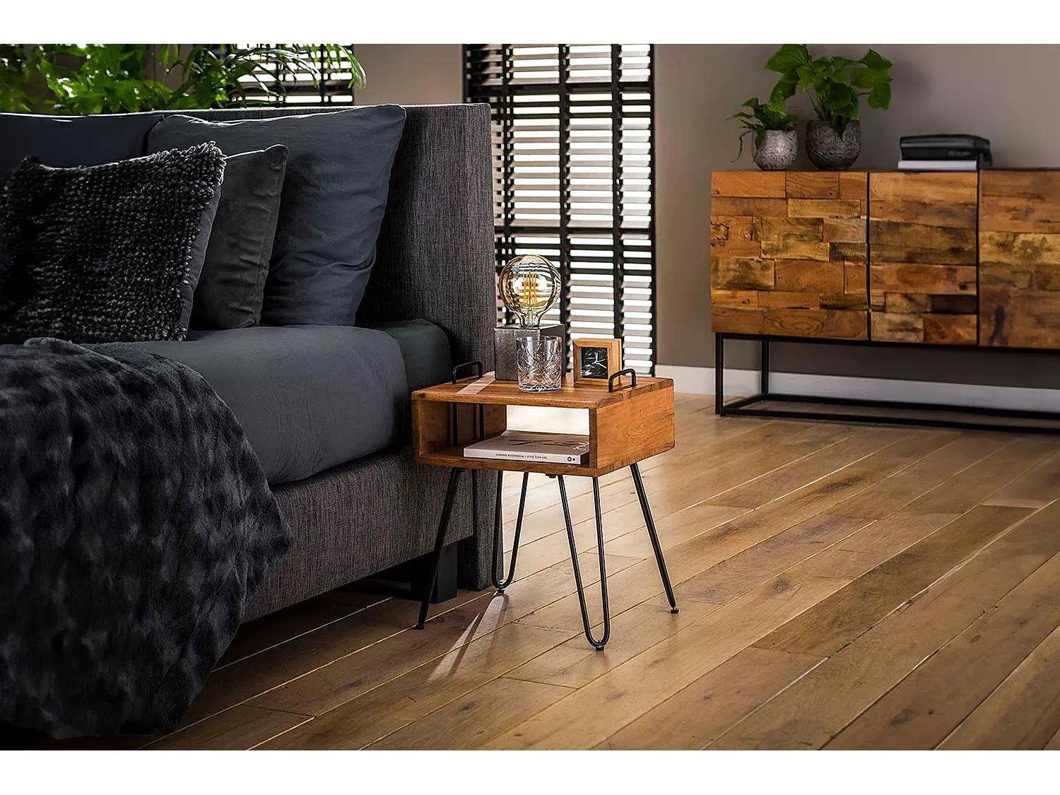 Dieser Nachttisch zeichnet sich durch ein modernes Design und praktische Funktionen aus. Hergestellt aus Akazienholz mit mattem transparenten Lack, fügt er sich harmonisch in Schlafzimmer oder Wohnzimmer ein. Ein offenes Fach bietet Platz für Bücher, Zeitschriften oder Alltagsgegenstände. Der Stahlrahmen sorgt für Stabilität und endet an der Oberseite, wo zwei Griffe das Anheben und Versetzen erleichtern. Mit seinen Maßen von 40 x 34 x 48 cm kann er vielseitig verwendet werden, sowohl als Nachttisch als auch als Beistelltisch. Die Kombination aus Holz und Metall macht ihn zu einem interessanten Element in jedem Raum. Eigenschaften: Massives Akazienholz, offenes Fach, integrierte Stahlgriffe.