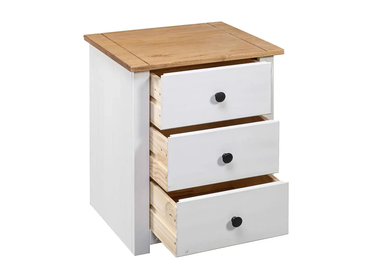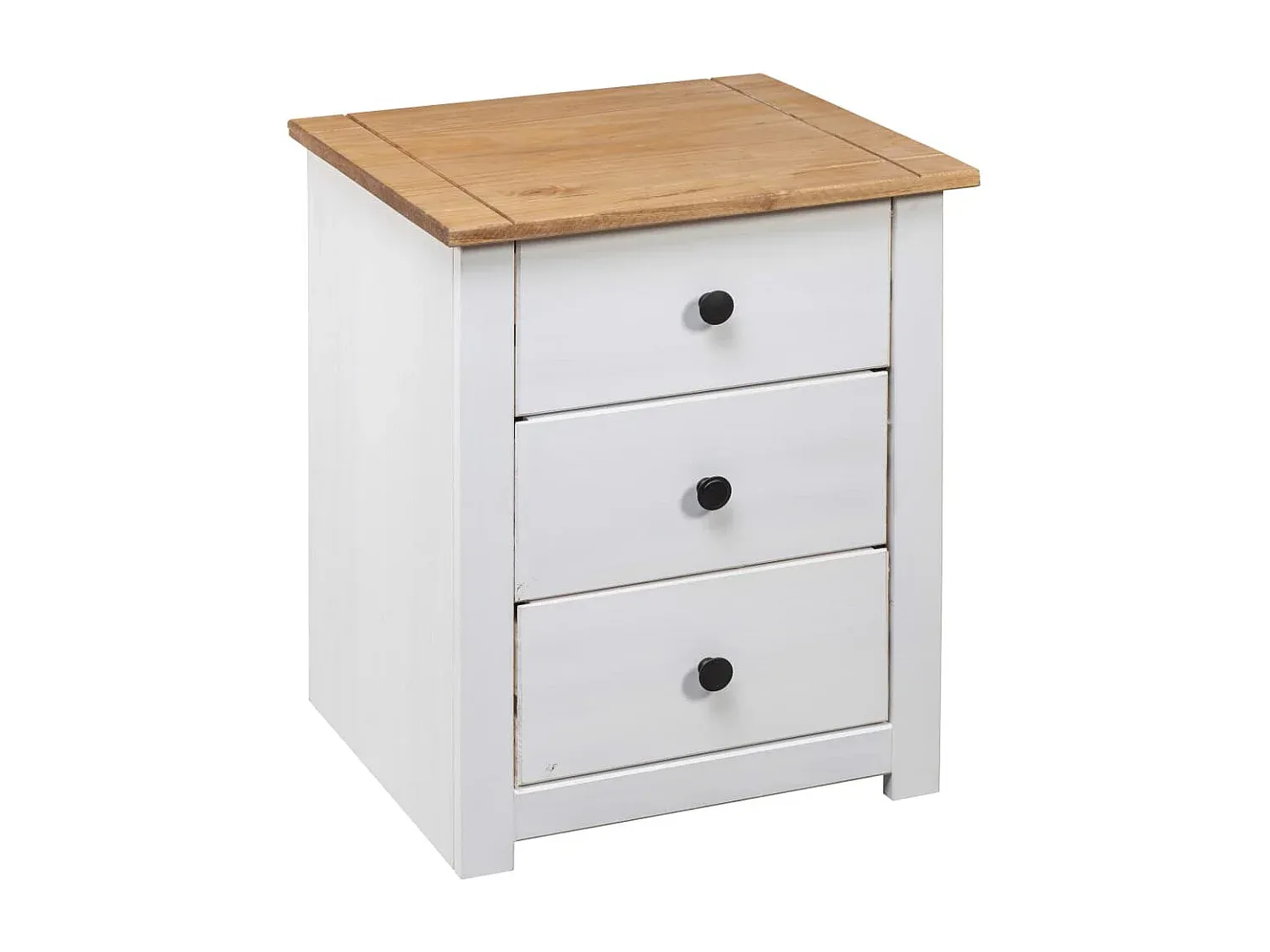 Dieser Nachtschrank aus Holz ergänzt die Inneneinrichtung und kann vielseitig genutzt werden, auch als Couchtisch. Gefertigt aus Kiefernholz, bietet er eine robuste Ablagefläche für Dekorationsgegenstände. Mit 3 Schubladen ausgestattet, bietet er Stauraum zur organiserten Aufbewahrung. Einfache Reinigung mit einem trockenen Tuch. Abmessungen: 46 x 40 x 57 cm.