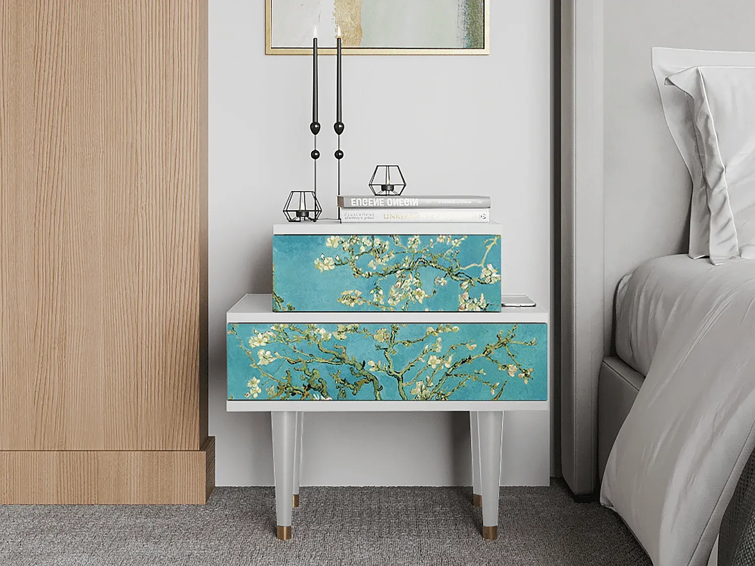 Ein vielseitiges Möbelstück mit kompaktem Design. Ideal zur Aufbewahrung von Schallplatten oder als Nachttisch. Die Front ist präzise ausgearbeitet und mit UV-Druck dekoriert. Die Oberfläche ist mit einem schützenden Lack überzogen. Das Möbelstück steht auf stabilen Holzbeinen mit Metallelementen, passend für verschiedene Einrichtungsstile. Maße: Breite: 58 cm, Höhe: 58 cm, Tiefe: 48 cm