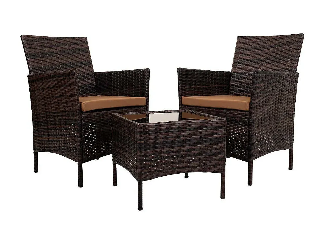 Dieses Set besteht aus einem Tisch und zwei Sesseln aus synthetischem Rattan. Der Tisch ist quadratisch mit einer Glasplatte und stabilen Beinen. Die Sessel sind mit einer geflochtenen Metallstruktur versehen und mit synthetischem Rattan überzogen. Sie bieten eine komfortable Sitzgelegenheit mit hohen Armlehnen und Rückenlehne. Die Kissen sind mit Polyesterstoff bezogen und haben eine Füllung aus Polyurethan. Ideal für den Einsatz im Außen- und Innenbereich. Der Tisch hat die Maße 45 x 45 x 39 cm, während die Sessel 68 x 59 x 83 cm groß sind. Farbe: Braun. Material: Rattan. Kapazität: 2 Personen. Einsatzbereich: Draußen.