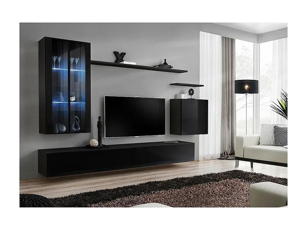 Dieses Set umfasst zwei TV-Bänke mit Abmessungen von 120x30x40 cm, einen hängenden Kubusblock mit einer Tür und einem Regal, sowie zwei hängende Vitrinen mit Glastüren und LED-Beleuchtung. Ein großes und ein kleines Regal sind ebenfalls enthalten. Die Struktur besteht aus laminierten Spanplatten, während die Fronten aus MDF gefertigt sind. Einfache Reinigung ist mit einem feuchten Schwamm oder Tuch möglich. Das Öffnungssystem ist ein Push & Touch-Mechanismus. Die TV-Möbel sind in mattem Schwarz gehalten mit glänzenden schwarzen Fronten. Die Gesamtmaße betragen 270 x 40 x 160 cm.