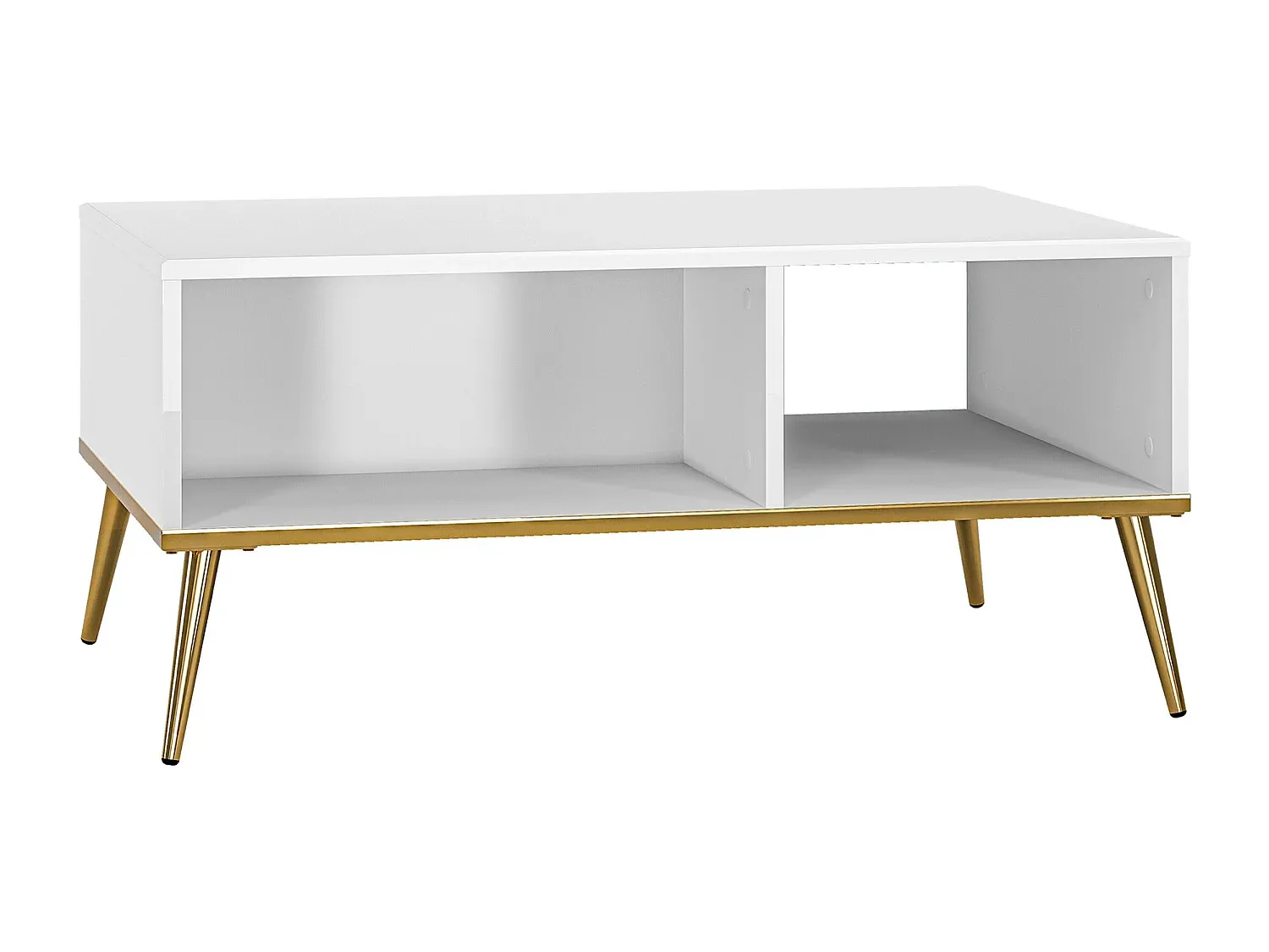 Der Wohnzimmertisch ist vielseitig einsetzbar und eignet sich als Couch- oder Beistelltisch. Das geradlinige Design kombiniert mit robusten Materialien wie laminierter Platte sorgt für Langlebigkeit. Die Metallbeine in Goldoptik setzen Akzente. Mit offenen Fächern bietet der Tisch Stauraum für Bücher und Dekorationsartikel und passt in moderne Wohnkonzepte. Produktdetails: Höhe: 41,9 cm, Breite: 90 cm, Tiefe: 60 cm. Korpus: laminierte Spanplatte, Weiß Matt. Fronten: MDF-Platte, Weiß Hochglanz. Füße: Goldfarbenes Metall. Kantenschutz: ABS-Bänder. Montage: Selbstmontage