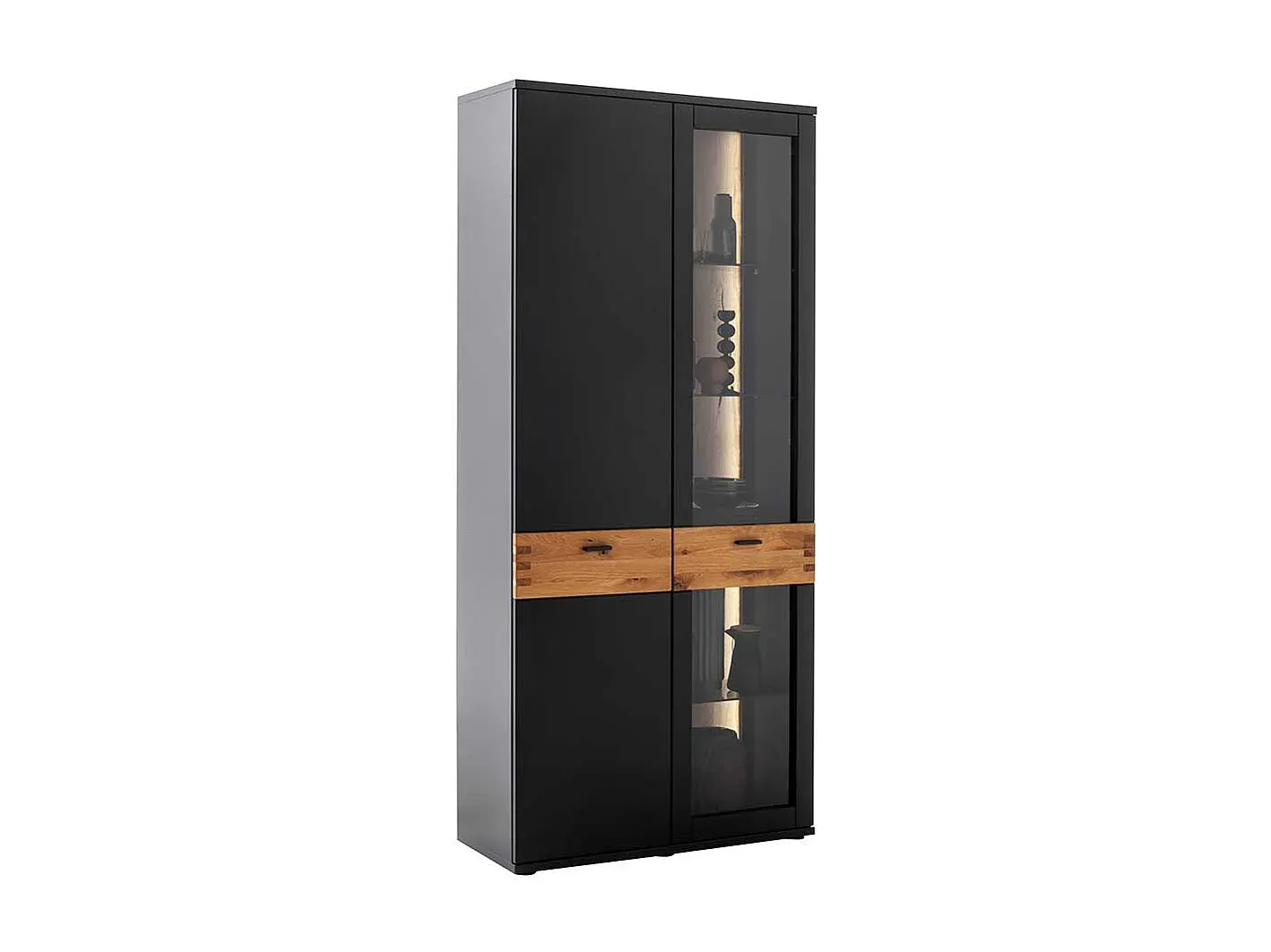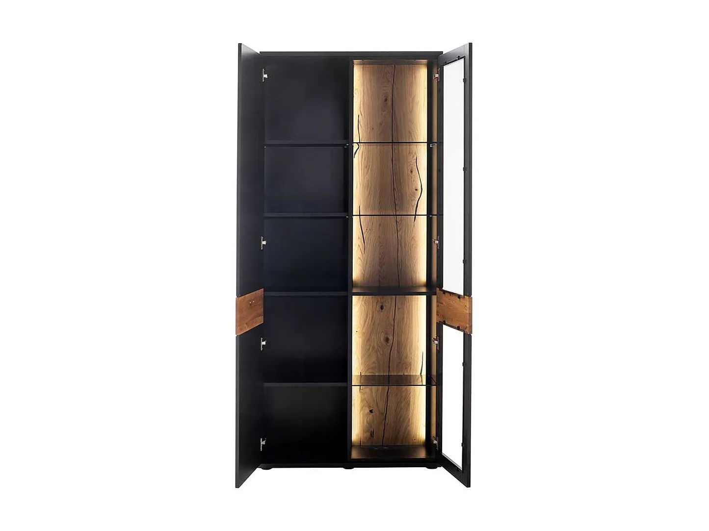 Schrankvitrine in Wildeichefarben Schwarzgrau mit zwei Türen und Metallgriffen. Die Innenaufteilung erfolgt mit Einlegeböden. Hergestellt aus Holzwerkstoff und Wildeiche Massivholz. Die Oberfläche ist echtholzfurniert, lackiert und geölt. Geeignet für das Wohnzimmer mit den Maßen: 90 cm Breite, 201 cm Höhe, 37 cm Tiefe.